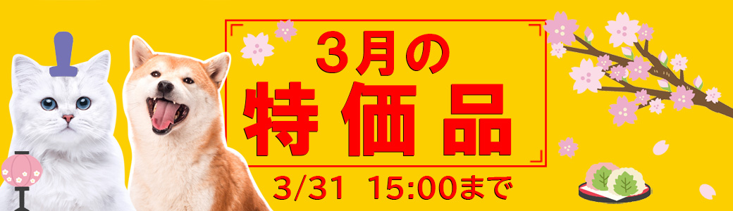 今月は「ドギーマンハヤシ」「ジェックス」「マースジャパン」「日本ペットフード」「ペティオ」「ペッツルート」「ペットプロ」「リッチェル」「三晃商会」「STIサンヨー」がセールを行っています。