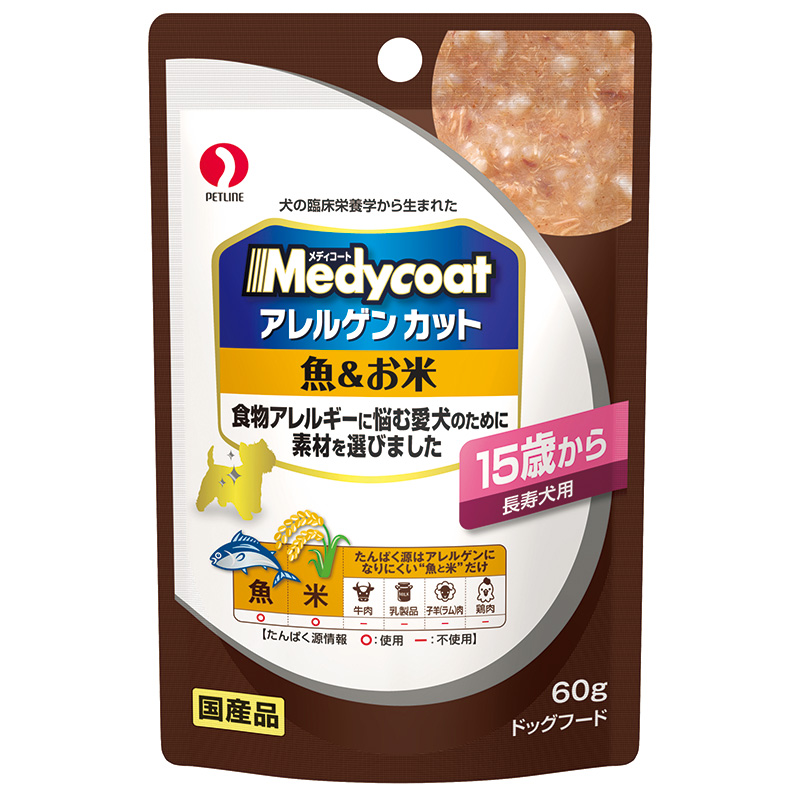 [ペットライン] メディコート アレルゲンカット パウチ 魚とお米 15歳から 長寿犬用 60g