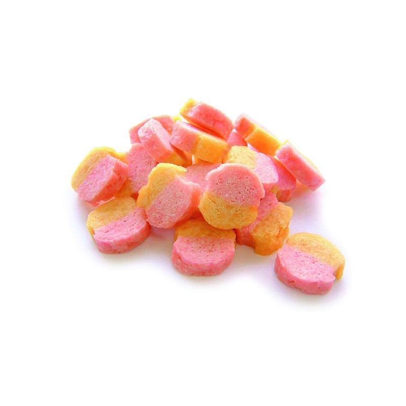| 素材 | <原材料> 小麦粉、鶏ささみ、ショートニング、さつま芋パウダー、苺パウダー、食塩、ソルビトール、プロピレングリコール、膨張剤、保存料(ソルビン酸K)、pH調整剤、着色料(赤106、黄4、黄5、酸化チタン)、香料、酸化防止剤(エリソルビン酸Na) <保証成分> たん白質11.0%以上、脂質3.5%以上、粗繊維0.5%以下、灰分3.0%以下、水分38.0%以下 <エネルギー> 260kcal/100g |