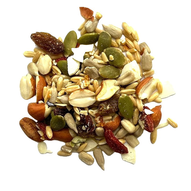 | 素材 | <原材料> むきひまわり、かぼちゃの種、レーズン、アーモンド、くこの実、むきえん麦、ピーナッツ、乳酸菌 <保証成分> 粗タンパク質9.7%以上、粗脂肪21.1%以上、粗繊維6.8%以下、粗灰分3.4%以下、水分7.5%以下 <エネルギー> 約450kcal/100g |
