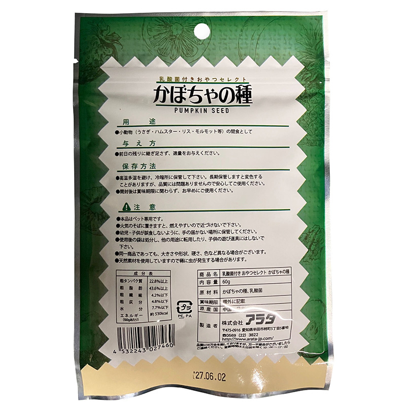 | 素材 | <原材料> かぼちゃの種、乳酸菌 <保証成分> 粗タンパク質22.8%以上、粗脂肪43.6%以上、粗繊維4.2%以下、粗灰分4.8%以下、水分7.7%以下 <エネルギー> 約530kcal/100g |