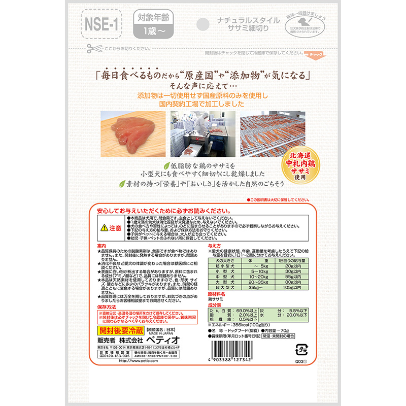 北海道・中札内鶏ササミを国内の契約工場で、添加物を一切使用せず加工した純国産のおやつです。
