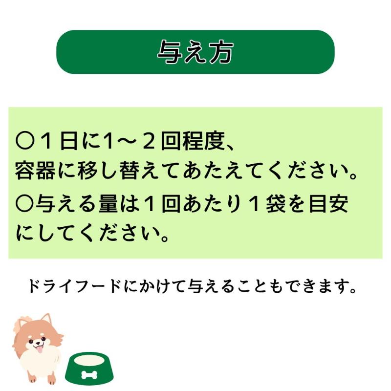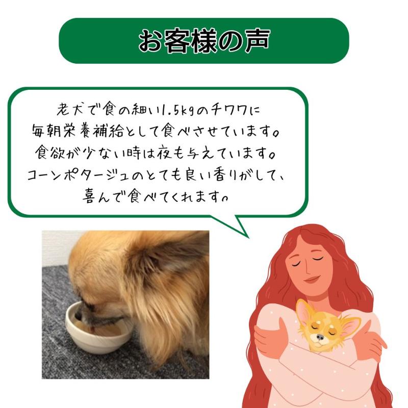| 素材 | <原材料> 鶏肉、コーンスターチ、ミルク(乳糖フリー)、肉エキス、ラクトスクロースシロップ(オリゴ糖)、チキンコンソメ、デキストリン、香料、ビタミン類(A、D3、E、B1、B2、B6、B12、ニコチン酸アミド、葉酸)、ミネラル類(Fe) <保証成分> 粗たん白質2%以上、粗脂肪0%以上、粗繊維1%以下、粗灰分1%以下、水分95%以下 <エネルギー> 約10kcal/1袋 |