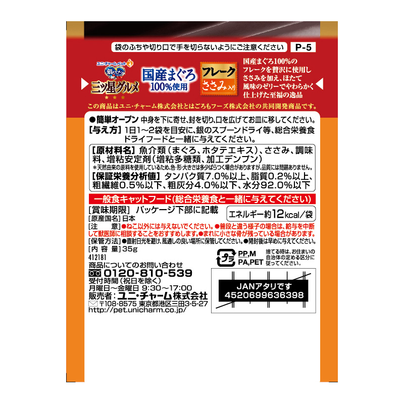 | 素材 | <原材料> 魚介類(まぐろ、ホタテエキス)、ささみ、調味料、増粘安定剤(増粘多糖類、加工デンプン) <保証成分> タンパク質7.0%以上、脂質0.2%以上、粗繊維0.5%以下、粗灰分4.0%以下、水分92.0%以下 <エネルギー> 約12kcal/1袋 |