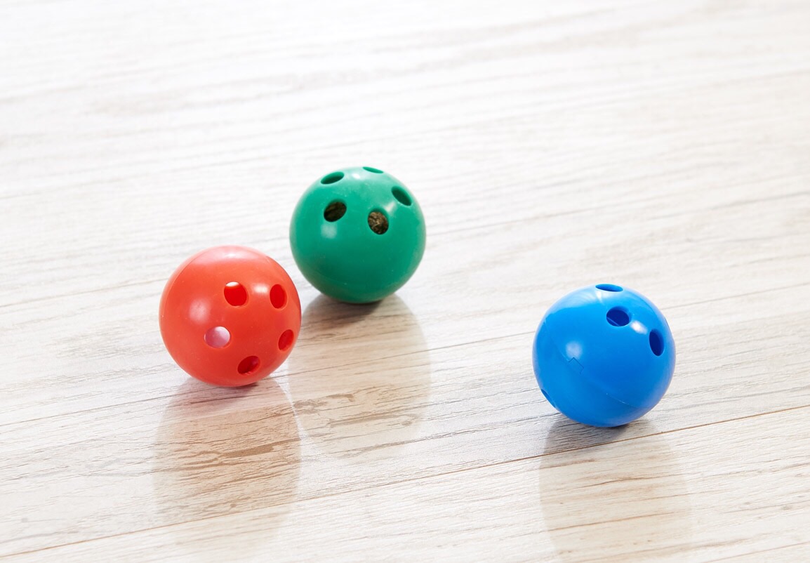 鈴入りボール(赤・青)、キャットニップ入りボール(緑)