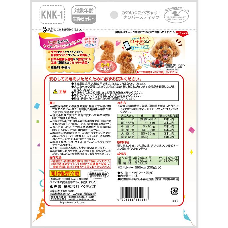 | 注意事項 | ※本商品は犬用で、間食用です。主食として与えないでください。 ※犬の食べ方や習性によっては、のどに詰まらせることがありますので必ず観察しながらお与えください。 ※与え方の給与量、および保存方法をお守りください。 ※子供がペットに与える場合は、大人が立ち会ってください。 ※幼児・子供・ペットのふれない所に保管してください。 |