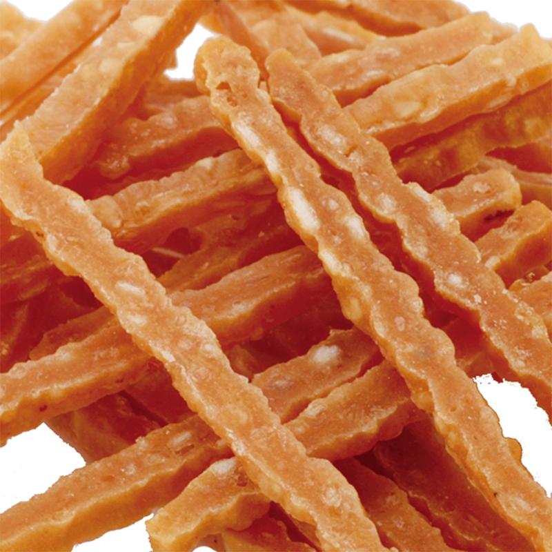 | 素材 | <原材料> 肉類(鶏ササミ、鶏肉)、小麦粉、牛皮、糖類、タピオカでん粉、卵黄粉末(グロビゲン)、植物油脂、加工でん粉、グリセリン、トレハロース、ソルビトール、増粘安定剤(キサンタンガム)ミネラル類(ナトリウム)、酸化防止剤(ビタミンC、ビタミンE)、ポリリン酸ナトリウム、ピロリン酸ナトリウム、着色料(クチナシ、マリーゴールド) <保証成分> 粗たん白質16.0%以上、粗脂肪0.1%以上、粗繊維2.0%以下、粗灰分4.5%以下、水分25.0%以下 <エネルギー> 320kcal/100g |