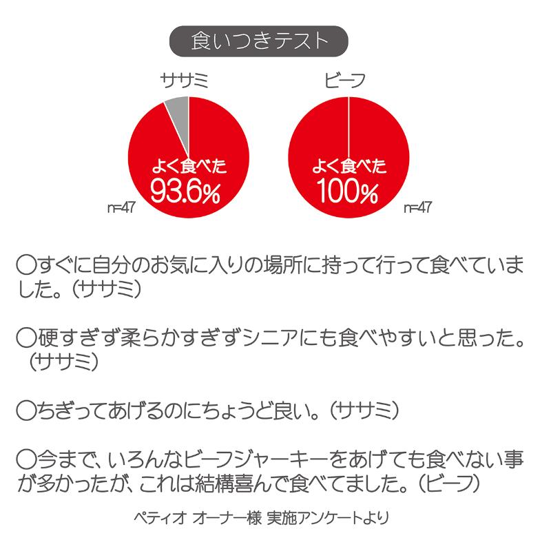 | 素材 | <原材料> 肉類(鶏・牛)、脱脂大豆、コラーゲン、小麦たん白、食塩、ソルビトール、プロピレングリコール、pH調整剤、保存料(ソルビン酸K・デヒドロ酢酸Na)、ポリリン酸Na、酸化防止剤(エリソルビン酸Na・V.E)、着色料(カラメル・赤102号)、乳酸Ca、発色剤(亜硝酸Na) <保証成分> たん白質34.0%以上、脂質8.0%以上、粗繊維1.0%以下、灰分6.5%以下、水分26.0%以下 <エネルギー> 338kcal/100g |