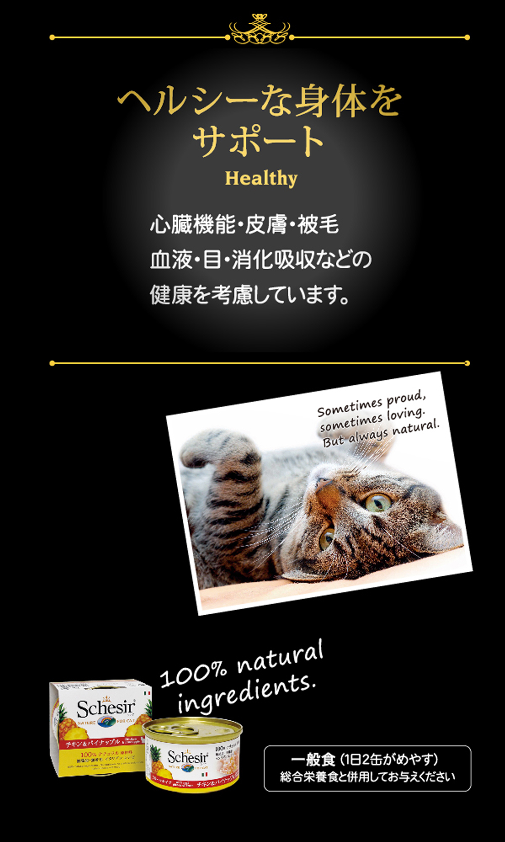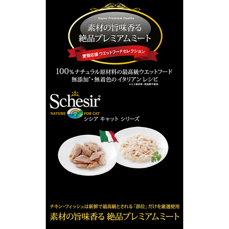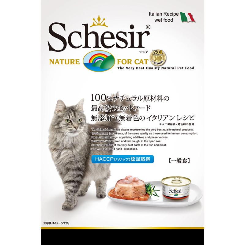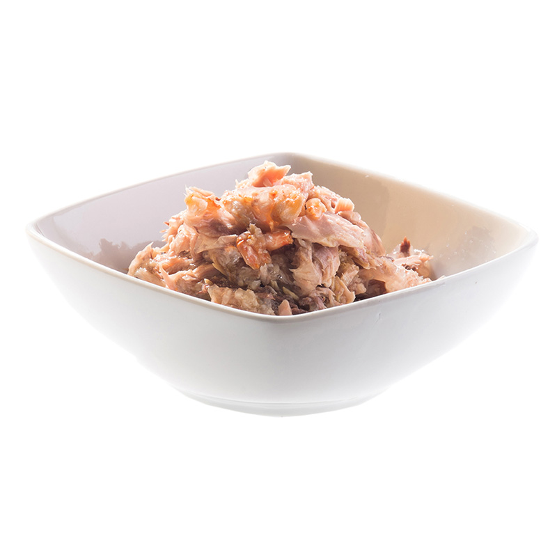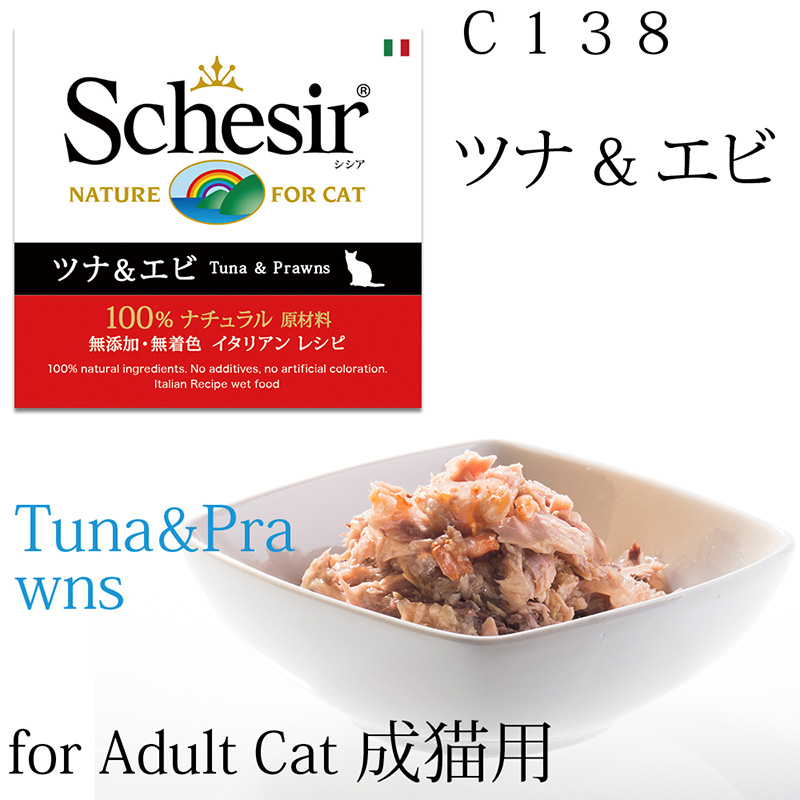 | 素材 | <原材料> ツナ51%※、エビ6%、ビタミンA1325IU、ビタミンE15mg、タウリン160mg ※原材料のツナはロットにより(A)Euthynnus affinis:スマか(B)Katsuwonus pelamis:カツオです。 <保証成分> 粗たん白質12%、粗脂肪0.8%、粗繊維0.5%、粗灰分1%、水分85% <エネルギー> 51kcal/100g |