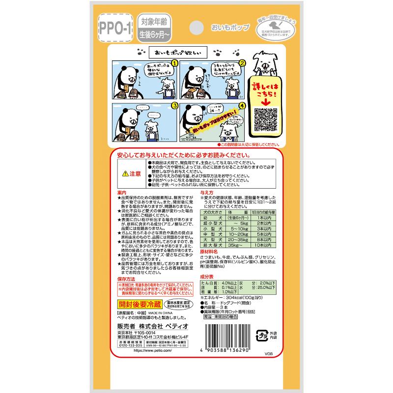| 素材 | <原材料> さつまいも、牛皮、でんぷん類、グリセリン、pH調整剤、保存料(ソルビン酸K)、酸化防止剤(亜硫酸Na) <保証成分> たん白質4.0%以上、脂質0.1%以上、粗繊維1.0%以下、灰分2.0%以下、水分25.0%以下 <エネルギー> 304kcal/100g |