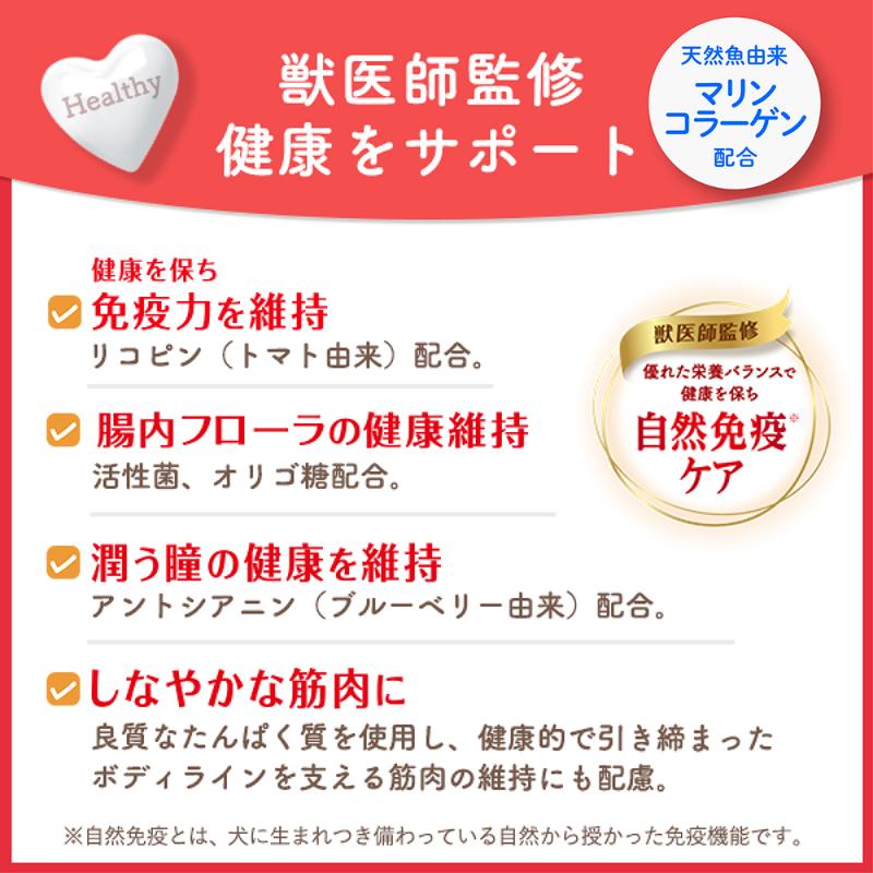 ・免疫力、美しい体型、歯の健康、おなかの健康、関節の健康の維持に配慮。着色料無添加、食べやすいハート型小粒。