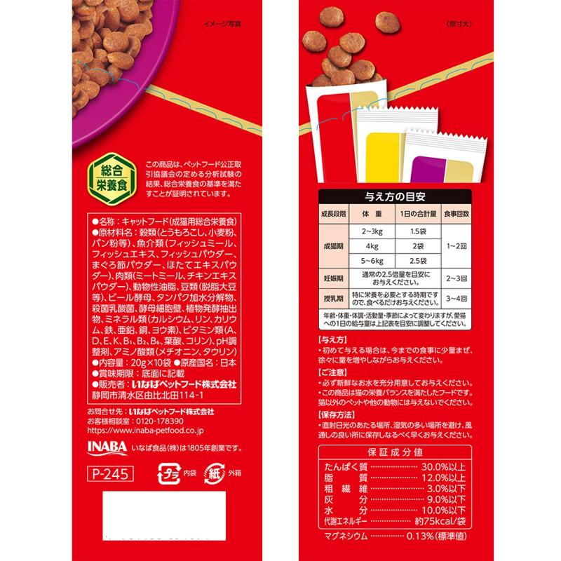 素材 | <原材料> 穀類(とうもろこし、小麦粉、パン粉等)、魚介類(フィッシュミール、フィッシュエキス、フィッシュパウダー、まぐろ節パウダー、ほたてエキスパウダー)、肉類(ミートミール、チキンエキスパウダー)、動物性油脂、豆類(脱脂大豆等)、ビール酵母、タンパク加水分解物、殺菌乳酸菌、酵母細胞壁、植物発酵抽出物、ミネラル類(カルシウム、リン、カリウム、鉄、亜鉛、銅、ヨウ素)、ビタミン類(A、D、E、K、B1、B2、B6、葉酸、コリン)、pH調整剤、アミノ酸類(メチオニン、タウリン) <保証成分> たんぱく質30.0%以上、脂質12.0%以上、粗繊維3.0%以下、灰分9.0%以下、水分10.0%以下 <エネルギー> 約75kcal/袋 |