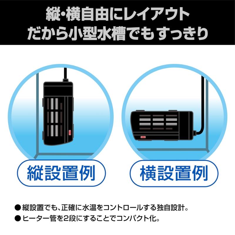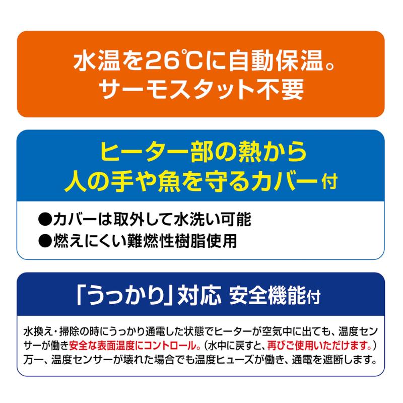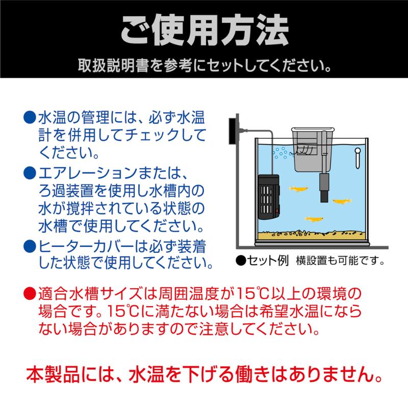 | 注意事項 | ・水温の管理には、必ず水温計を併用してチェックしてください。 ・本製品には、水温を下げる働きはありません。 ・エアレーション又は、ろ過装置を使用し水槽内の水が撹拌されている状態の水槽で使用してください。 ・適用水槽サイズは周囲温度が15℃以上の環境の場合です。15℃に満たない場合は希望水温にならない場合があります。 ・ヒーターカバーは必ず装着した状態で使用してください。 |