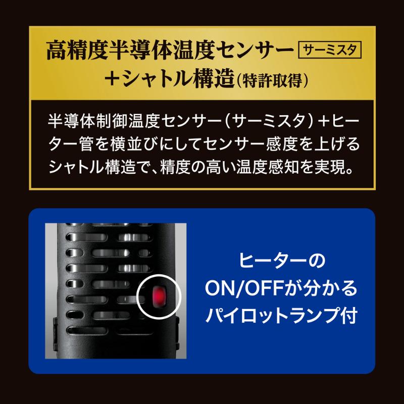 ・半導体制御温度センサー(サーミスタ)+ヒーター管を横並びにしてセンサー感度を上げるシャトル構造で、精度の高い温度感知を実現。