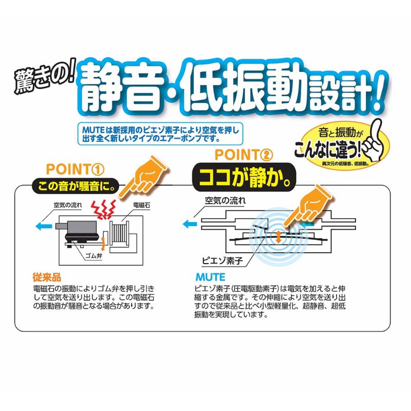電磁石の振動で空気を押し出す従来のエアーポンプと異なり、ピエゾ素子(圧電駆動素子)自身が伸縮し空気を押し出すため小型軽量化、超静音、超低振動を実現しました。