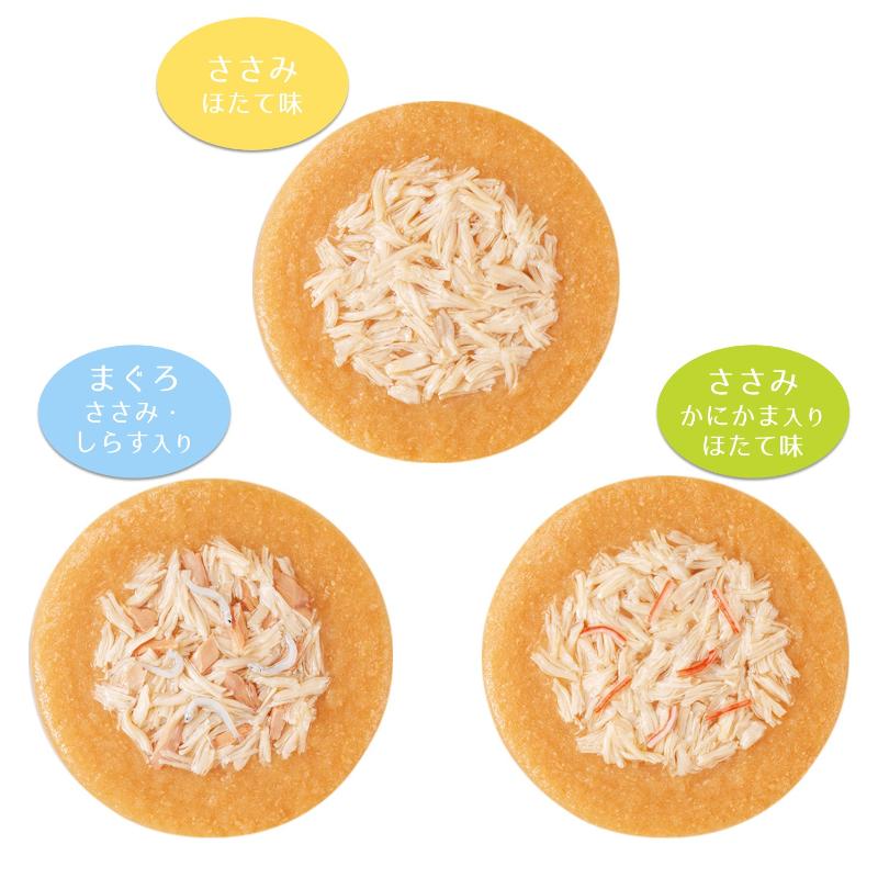 | 素材 | <原材料> <まぐろ ささみ・しらす入り> 鶏肉(ささみ)、まぐろ、しらす、かつお節エキス、糖類(オリゴ糖等)、植物性油脂、増粘安定剤(加工でん粉、増粘多糖類)、ミネラル類(Na、P、Cl)、調味料(アミノ酸)、ビタミンE、トマト色素、緑茶エキス <ささみ ほたて味> 鶏肉(ささみ)、ほたてエキス、糖類(オリゴ糖等)、植物性油脂、増粘安定剤(加工でん粉、増粘多糖類)、ミネラル類(Na、P、Cl)、調味料(アミノ酸)、ビタミンE、トマト色素、緑茶エキス <ささみ かにかま入り ほたて味> 鶏肉(ささみ)、かに風味かまぼこ、ほたてエキス、糖類(オリゴ糖等)、植物性油脂、増粘安定剤(加工でん粉、増粘多糖類)、ミネラル類(Na、P、Cl)、調味料(アミノ酸)、ビタミンE、トマト色素、緑茶エキス <保証成分> たんぱく質5.0%以上、脂質0.2%以上、粗繊維0.1%以下、灰分2.0%以下、水分92.5%以下 <エネルギー> 約20kcal/袋 |