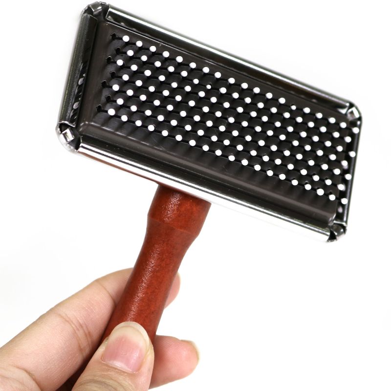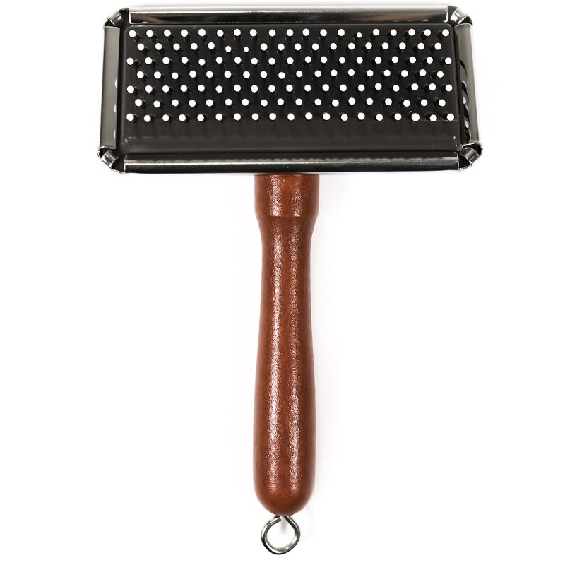 クッション性のあるやわらかな樹脂製先丸ピンが抜け毛をやさしく取り去る。金属ピンのスリッカーブラシが使えない子にも使えて便利。毛肌が弱めのペットの抜け毛、毛玉とりに。木製持ち手で持ちやすい。
