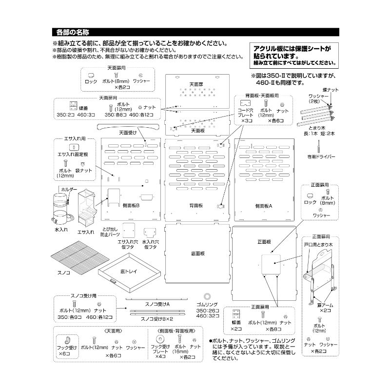 | 素材 | 本体:アクリル、PVC 底トレイ:PVC、アルミニウム合金 スノコ:ステンレス エサ入れ:アクリル、PS、天然木 水入れ:PS、PP とまり木:天然木、スチール、ステンレス ゴムリング:シリコン ボルト・ナット・蝶番:PC ワッシャー:PA フック受け:亜鉛合金 |