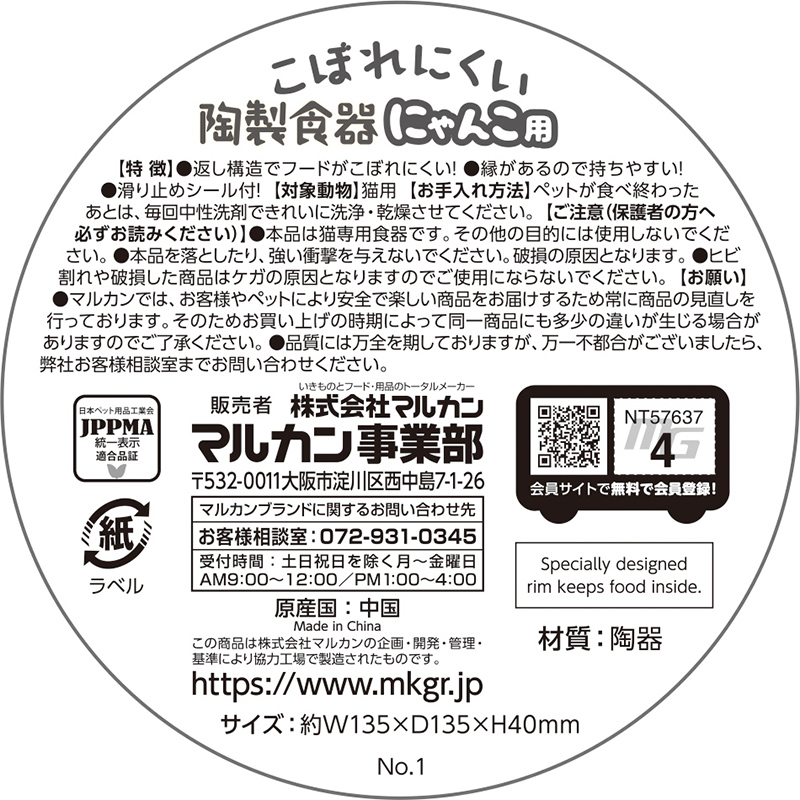 注意事項 | ・本品は猫専用食器です。その他の目的には使用しないでください。 ・本品を落としたり、強い衝撃を与えてください。破損の原因となります。 ・ヒビ割れや破損した商品はケガの原因となりますのでご使用にならないでください。 |