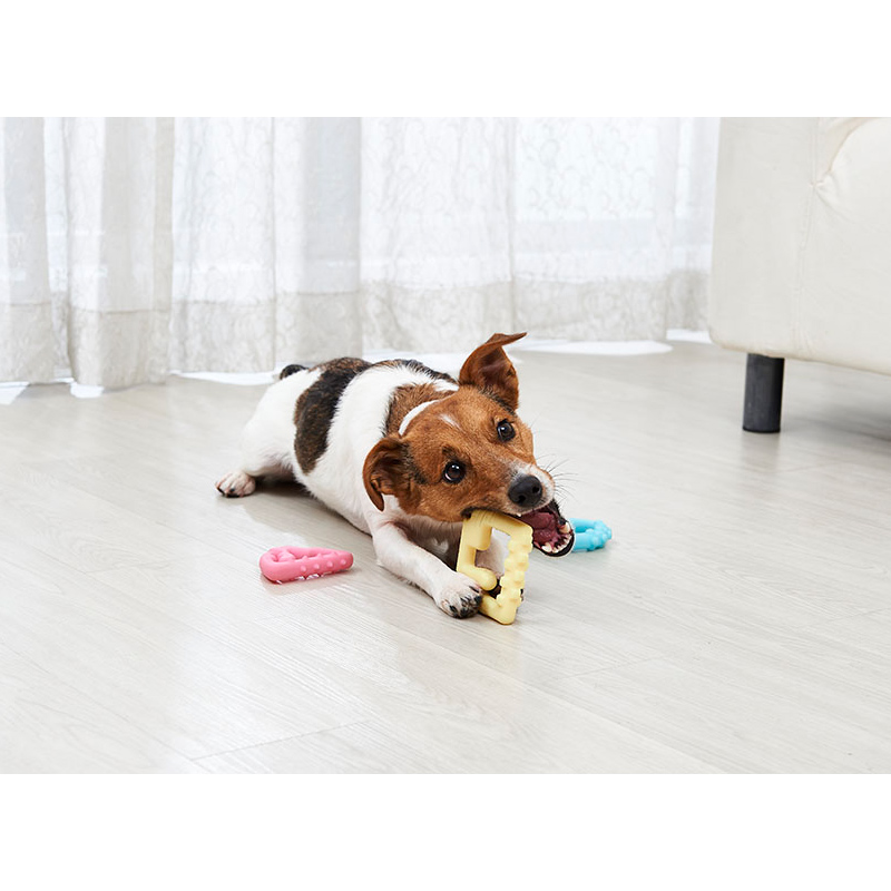 小型犬や仔犬でも咥えやすいサイズ。凹凸を噛むことで歯磨き効果・ミルクの香り付き。いろんなモノと組み合わせてオリジナルのおもちゃが作れる。ちぎれにくい天然ゴムを使用。