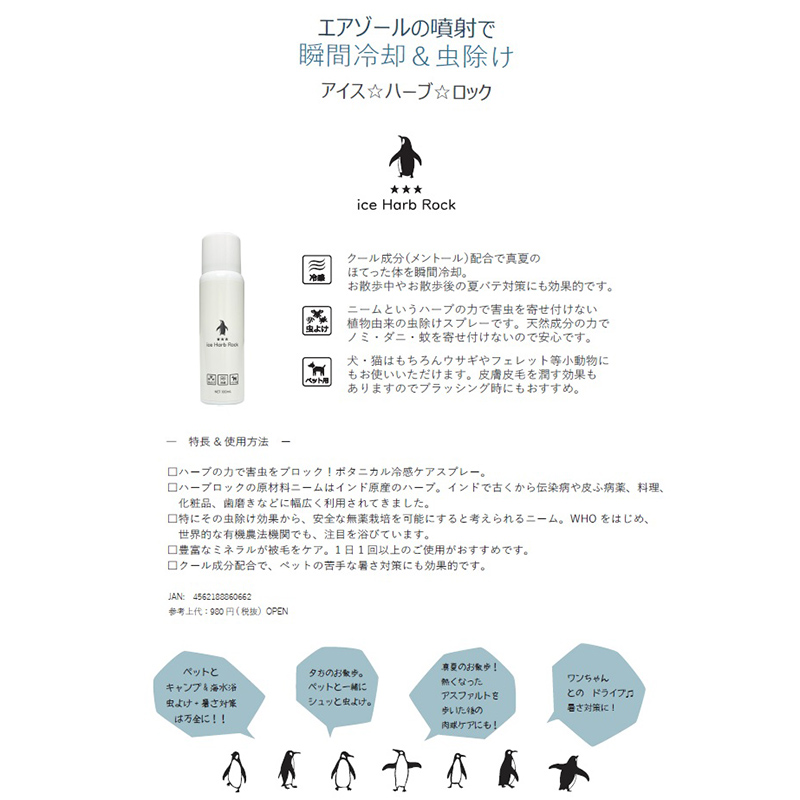 クール成分(メントール)配合で真夏のほてった体を瞬間冷却。お散歩中やお散歩後の夏バテ対策にも効果的です。