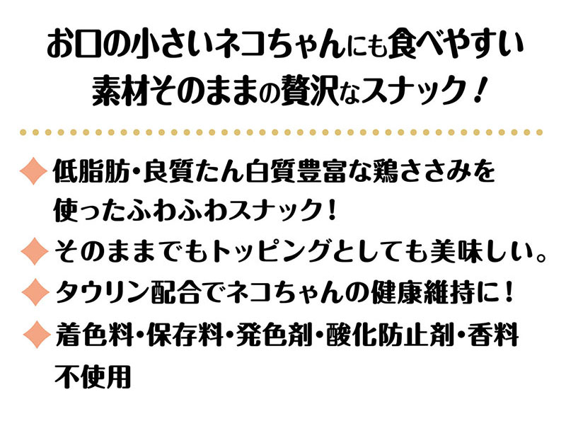 ・お口の小さいねこちゃんにも食べやすい素材そのままの贅沢スナックです。