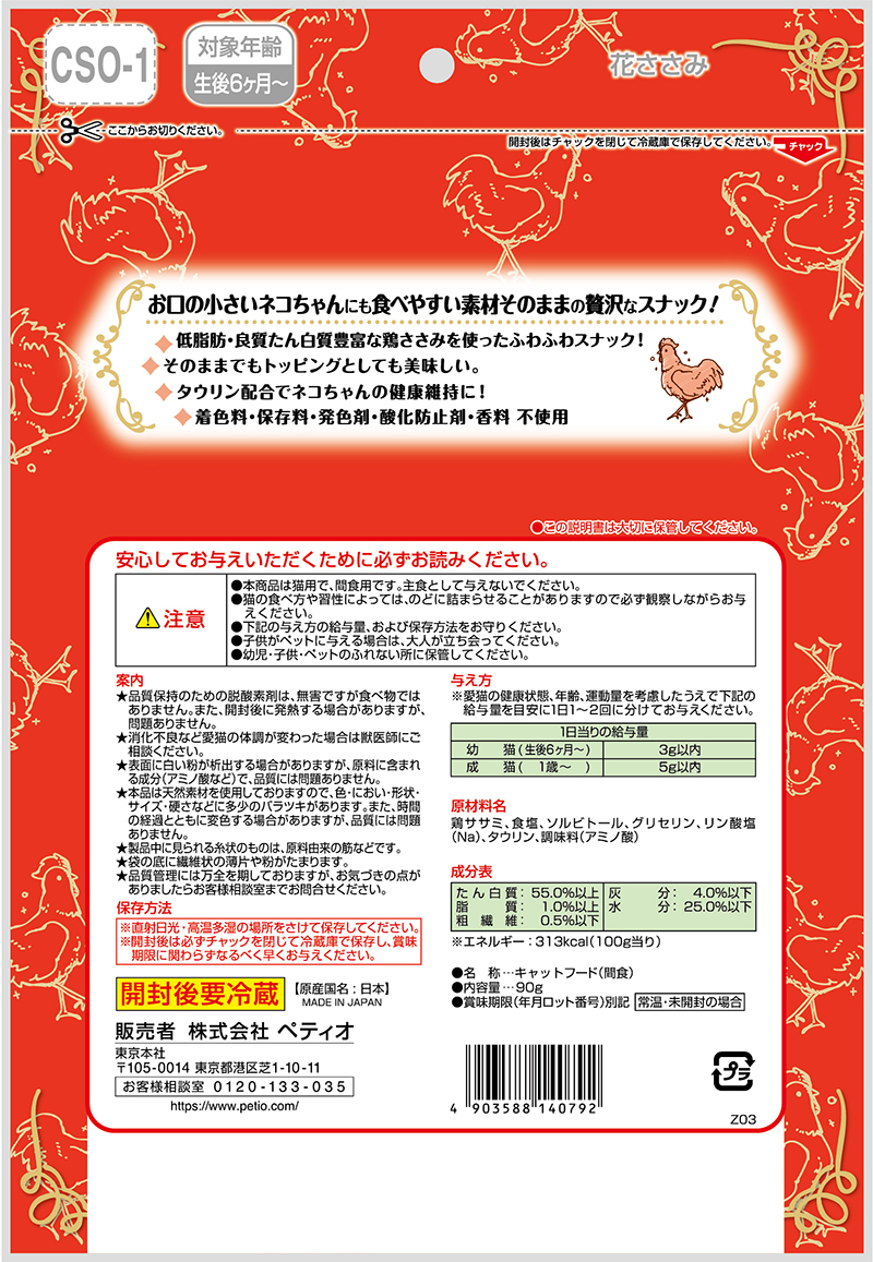 | 素材 | <原材料> 鶏ササミ、食塩、ソルビトール、グリセリン、リン酸塩(Na)、タウリン、調味料(アミノ酸) <保証成分> 粗たん白質55.0%以上、粗脂肪1.0%以上、粗繊維0.5%以下、粗灰分4.0%以下、水分25.0%以下 <エネルギー> 313kcal/100g |
