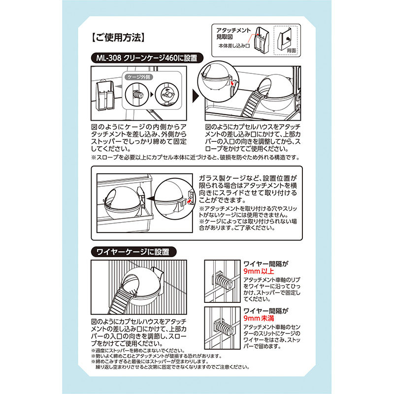 | 注意事項 | ・本品は小動物用専用です。他の目的には使用しないでください。 |