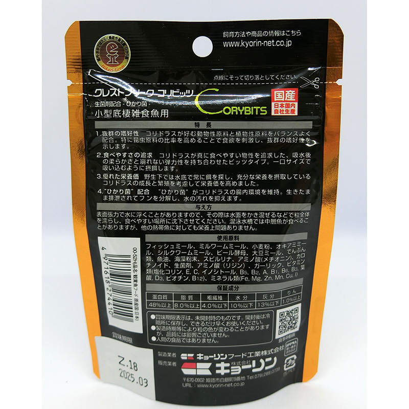 コリドラスが真に食べやすい物性を追求した、吸水後の柔らかさと崩れない弾力性を持ち合わせたビッツタイプ。一口サイズで吸い込むように摂餌します。