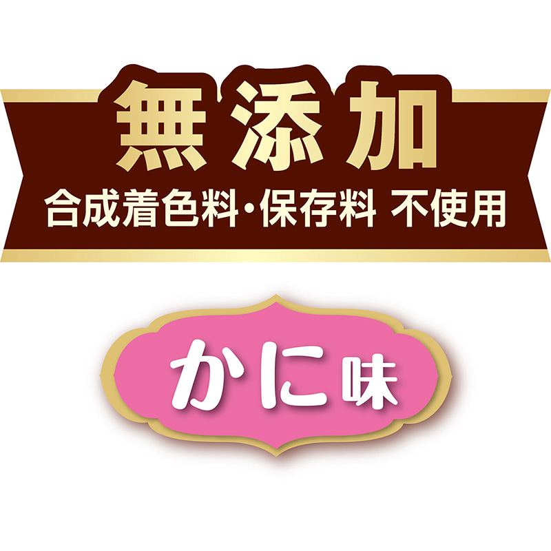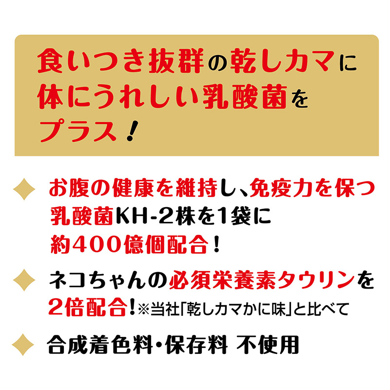 お腹の健康を維持し、免疫力を保つナノ型乳酸菌KH-2株を1袋に約400億個配合しています。ネコちゃんの必須栄養素タウリンを2倍配合。(当社「乾しカマかに味」と比べて)保存料 不使用。