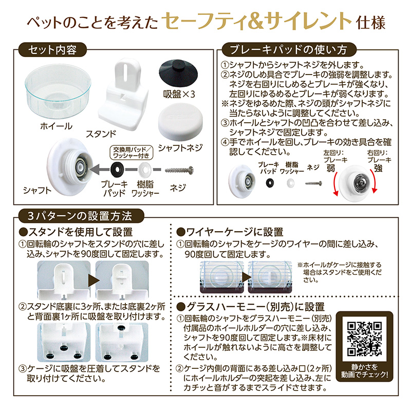 注意事項 | ・子供がペットと遊ぶ時は、必ず大人が付き添ってください。 ・水槽などで使用する場合(置いただけの状態)では、ホイールが転倒する場合があります。 ・ベアリングの構造上、ベアリングのブレに若干のバラつきがあります。ご了承ください。 ・スタンドや、取り付けたケージの振動などにより、音が発生する場合があります。シャフトとホイールにガタつきがないか確認してください。 ・スタンドのシリコンクッションをむやみに剥がさないでください。使用中に剥がれてきた場合は、新しいスタンドに交換してください。 ・吸盤取付部の汚れをきれいに拭き取ってから圧着してください。 ・吸盤が不要な場合は、必ず吸盤を外してご使用ください。かじり行為の原因になります。 ・吸盤が外れたままで使用するとかじる場合がありますので、常に確認し外れている場合は圧着してください。 ・複数の生き物が居る場所(多頭飼い等)では使用しないようにしてください。 ・ペットは予期せぬ行動をとる恐れがありますので、目の届く範囲で飼育してください。 ・飼育時における事故等に関しましては責任を負いかねますのでご了承ください。 ・ペットや用品(器具)に触れた後は、手をよく洗ってください。 ・廃棄する場合は、各自治体の廃棄ルールに従ってください。 【ご使用上の注意】 ・本製品はハムスター等の小動物の屋内飼育専用です。他の目的には使用しないでください。 ・本製品の取り扱いは丁寧に行ってください。投げたり、転がしたりしないでください。 ・火気には絶対に近づけないでください。 ・直射日光の当たる場所、高温多湿の場所に保管しないでください。変形、破損の原因になります。 ・幼児が本製品で遊んだりしないよう注意してください。 ・各パーツをむやみにばらさないでください。 ・子供にセットさせる時は必ず大人の監視のもとで行ってください。 ・本製品を設置する場所は、水平が保たれる安定した平面を選んでください。 |