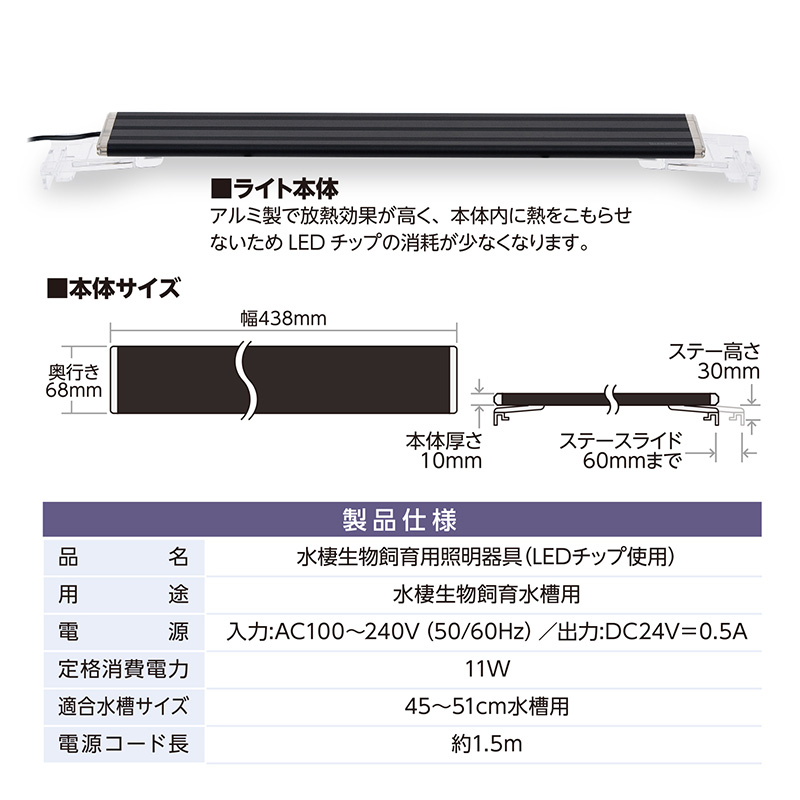 サイズ | パッケージサイズ:W460×H75×D50mm/重量500g 本体サイズ:奥行68mm×幅438mm、ステー高さ30mm、ステースライド60mmまで、本体厚さ10mm |