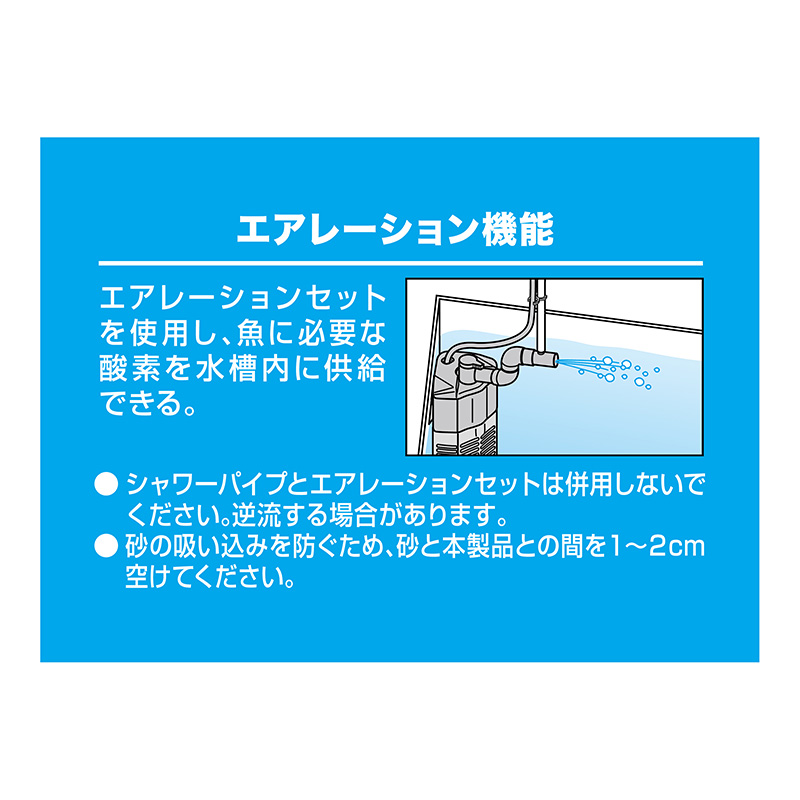 | 注意事項 | ・底砂の種類、粒サイズによっては、水流で底砂が舞う場合があります。 【安全にお使いいただくために】 取扱説明書本文に出てくる警告・注意事項の部分は、製品をお使いいただく前に注意深く読み、よく理解してください。 ・本製品は屋内観賞魚飼育専用です。他の目的、屋外では使用しないでください。 ・子供に操作・セットさせる場合は、大人の監視のもとで行ってください。 ・セット時、魚の出し入れ、点検、掃除など水中に手を入れる時は、必ず水槽で使用している電気製品全て差し込みプラグを抜いてください。 ・本製品は、直射日光のあたる所や湿気、ほこりの多い所、油煙や湯気のあたる所では使用しないでください。 ・海水水槽で使用する場合は、塩分や汚れをこまめに拭きとってください。 |
