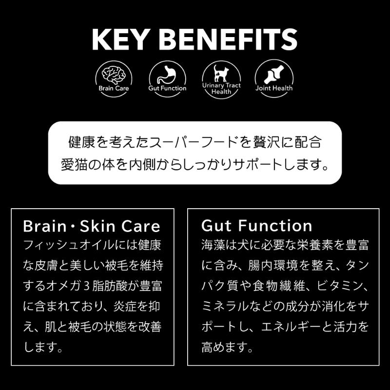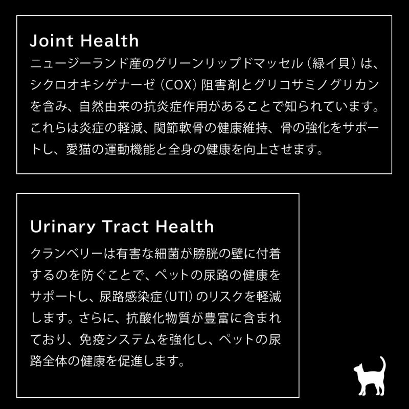 サーモンはオメガ3脂肪酸が豊富で、健康な被毛、皮膚、関節をサポートし、ラム肉はエネルギーレベルを維持し、猫の成長と全体的な健康をサポートする必須アミノ酸と食事性脂肪を提供します。