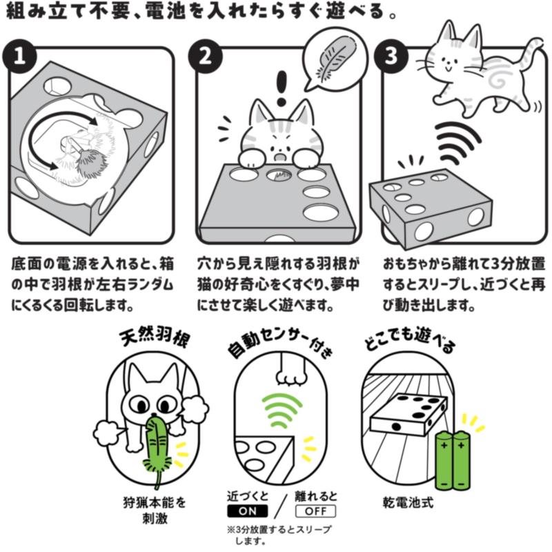 ・箱の中で羽根が左右ランダムにくるくる回る電動猫玩具です。