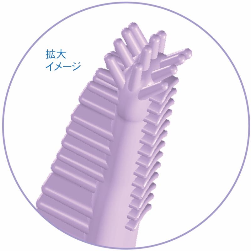 奥のすき間に入りやすいスリムヘッド&スリムネック、小さなお口・歯に最適です。ラバーの柔らかい毛質でペットが嫌がりにくく、やさしく磨くことができます。先端にも毛を配置、安心クッションにもなっています。幅広形状、斜め配列の毛が歯に密着し歯垢をからめとる。同時に複数本磨ける。3D形状の柄は獣医師推奨のペングリップがしやすく、やさしく磨き圧をコントロールできます。