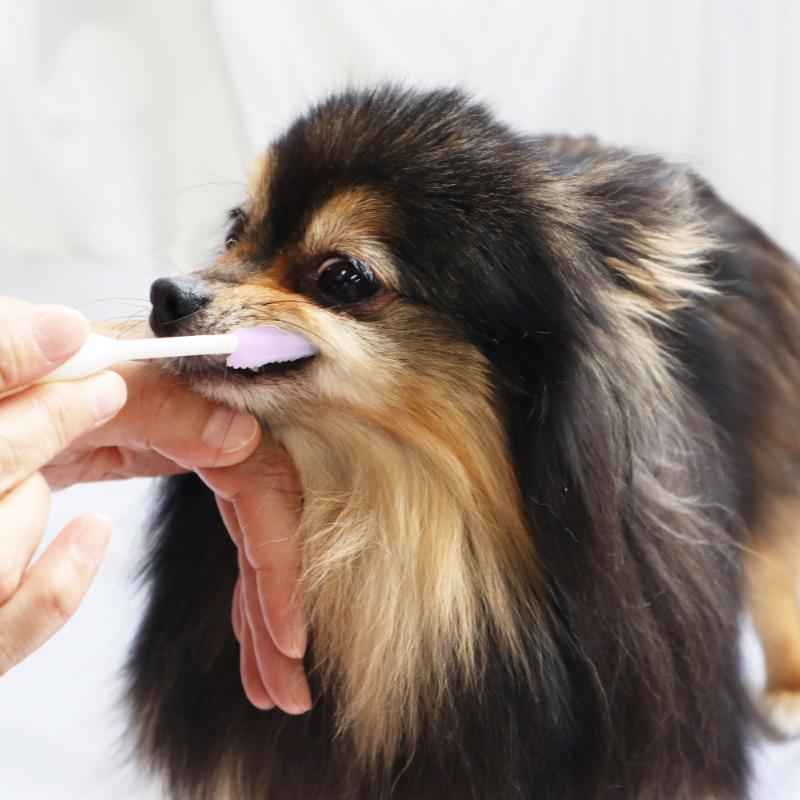 ブラシを水で濡らしてください。初めての場合はやさしくマズル周りに当てながら慣れさせてください。慣れてきたら歯と歯茎の上に当てマッサージするようにブラッシングをしてください。
