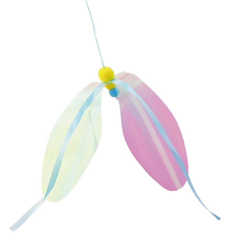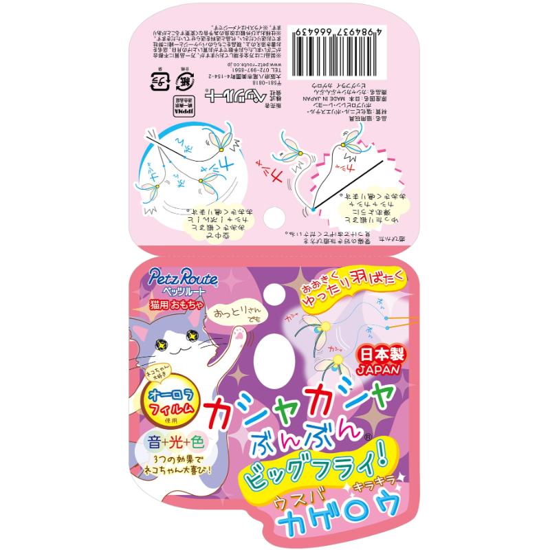 おおきなオーロラフィルムのハネフィルムを使用し、カシャカシャ音とキラキラ光と見やすい色で猫ちゃんの狩猟本能を刺激します。フワフワカシャカシャと飛び回るウスバカゲロウさん。