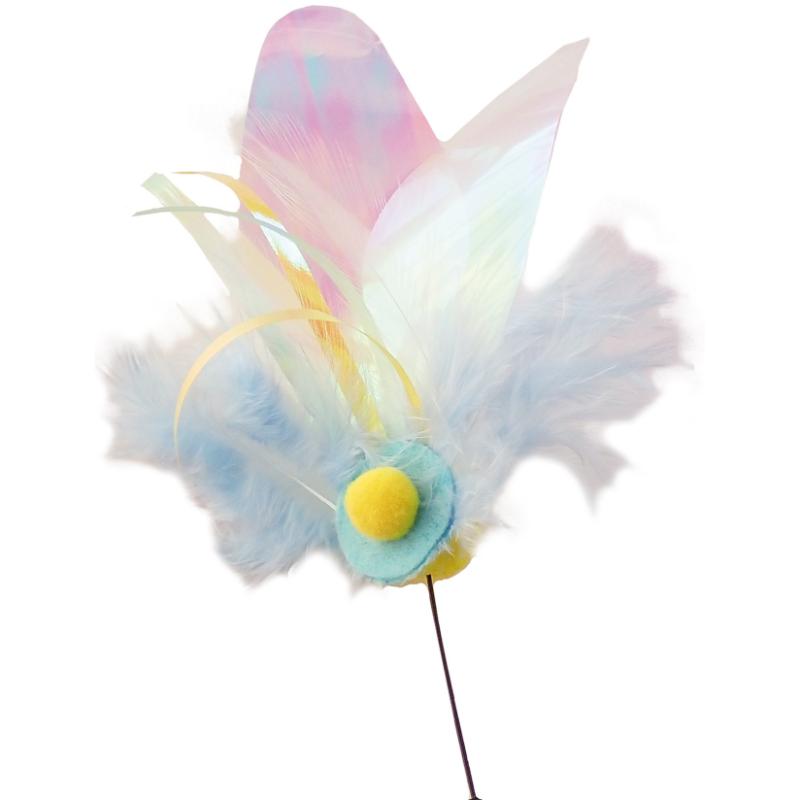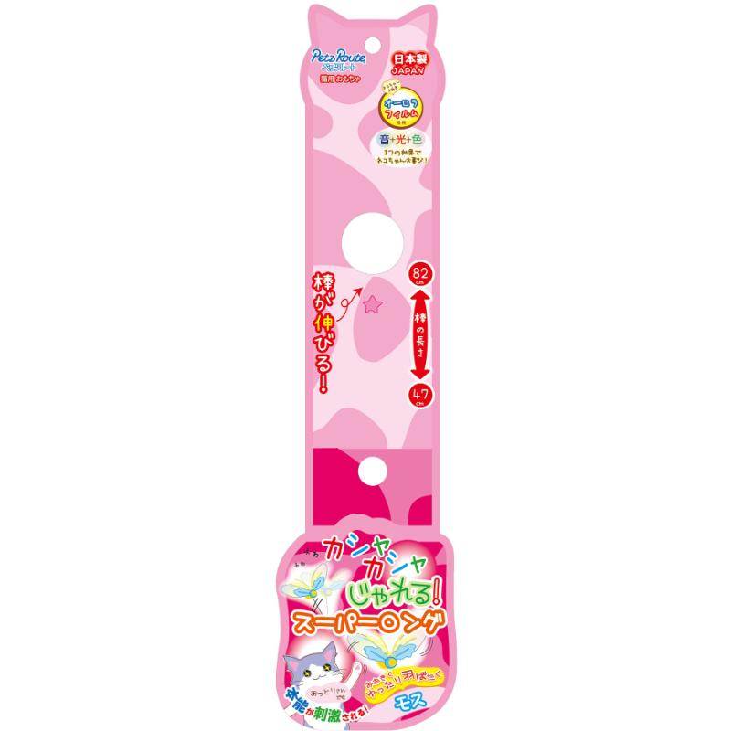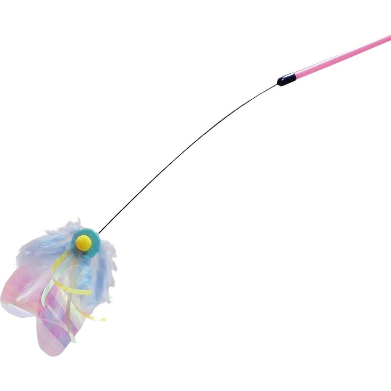 伸縮する棒の先におおきなオーロラフィルムのハネフィルムを使用した大ぶりのモチーフ。天然羽根の触覚と翼のモスが本能をくすぐります。カシャカシャ音とキラキラ光と見やすい色で猫ちゃんの狩猟本能を刺激します。