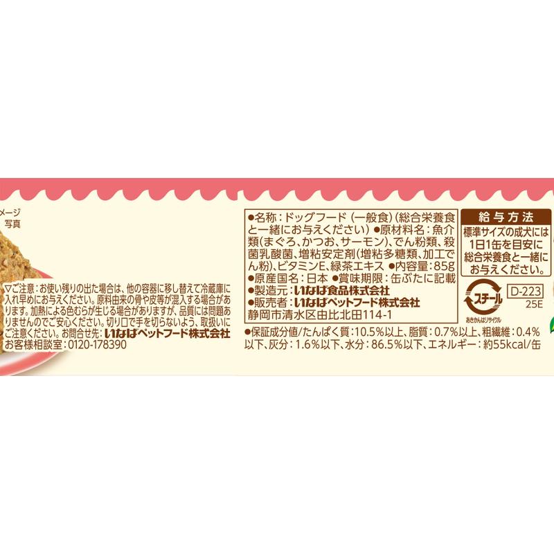 素材 | <原材料> 魚介類(まぐろ、かつお、サーモン)、でん粉類、殺菌乳酸菌、増粘安定剤(増粘多糖類、加工でん粉)、ビタミンE、緑茶エキス <保証成分> たんぱく質10.5%以上、脂質0.7%以上、粗繊維0.4%以下、灰分1.6%以下、水分86.5%以下 <エネルギー> 約55kcal/缶 |