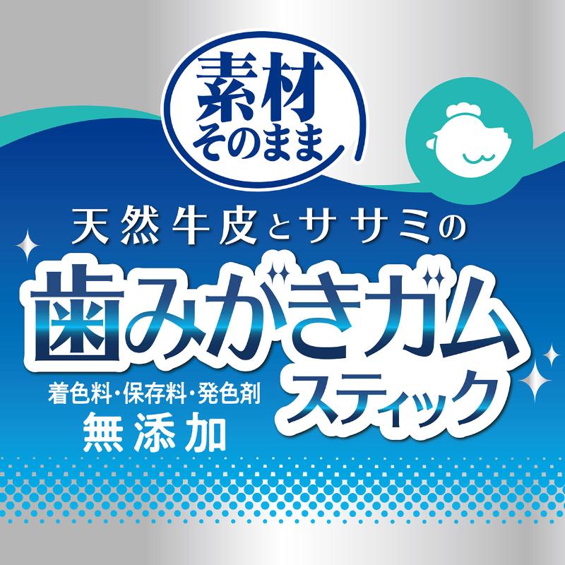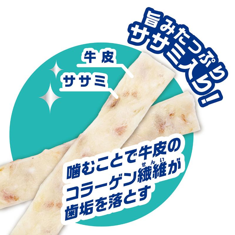 ・コラーゲン繊維豊富な天然牛皮に低脂肪・良質たん白質豊富で旨味たっぷりなササミを練りこみ、さらにササミ粒を入れることでおいしくデンタルケア。噛むことでコラーゲン繊維が汚れをからめて落とす!
