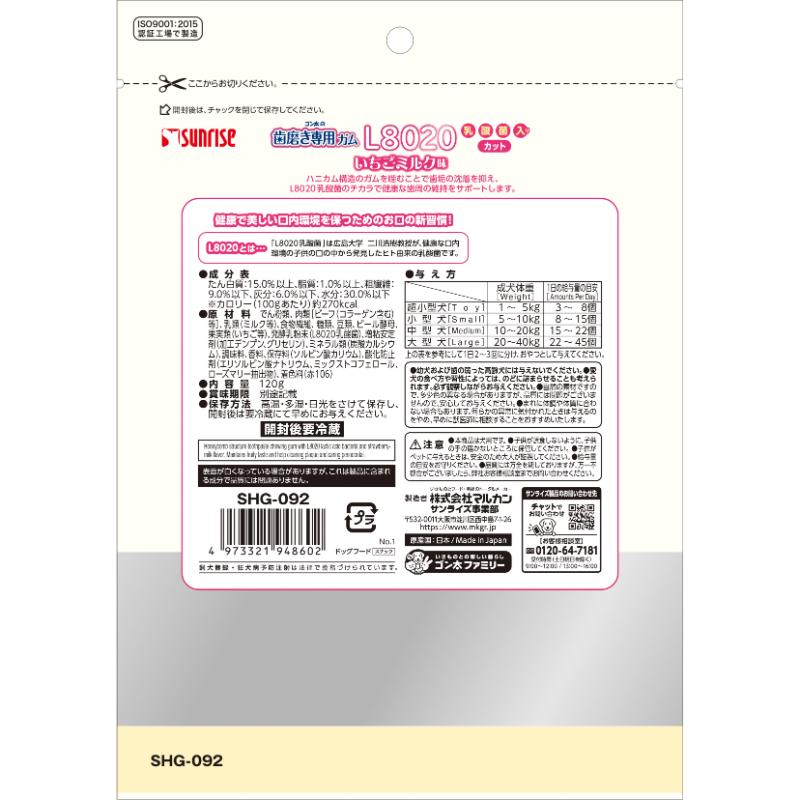 [マルカン サンライズ]ゴン太の歯磨き専用ガム L8020乳酸菌入り いちごミルク味 カット 120g