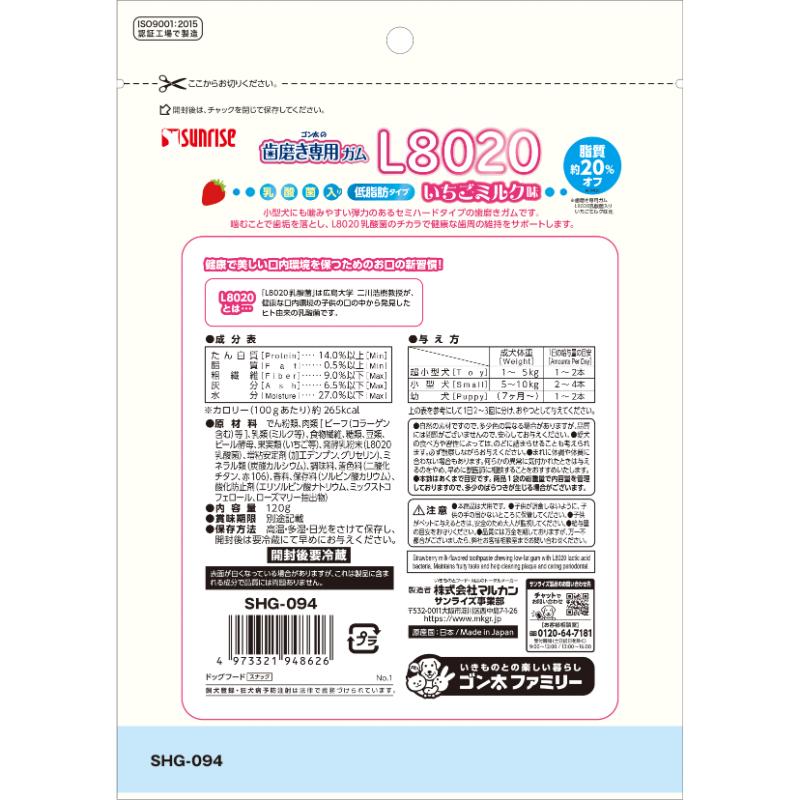 [マルカン サンライズ]ゴン太の歯磨き専用ガム L8020乳酸菌入り いちごミルク味 SSサイズ 低脂肪タイプ 120g