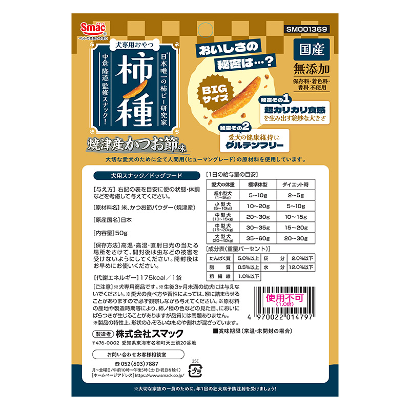 ・大切な愛犬のために全て食品用(ヒューマングレード)の原材料を使用した犬用スナック「柿ノ種」です。