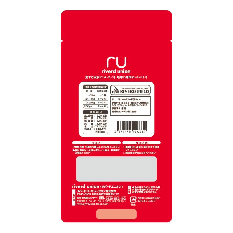 | 素材 | <原材料> 鶏ささみ、鴨ささみ、植物性たん白、グリセリン、保存料(ソルビン酸K) <保証成分> たんぱく質7.0%以上、脂質6.5%以上、粗繊維0.5%以下、灰分3.5%以下、水分77.5%以下 <エネルギー> 約31kcal/1本 |
