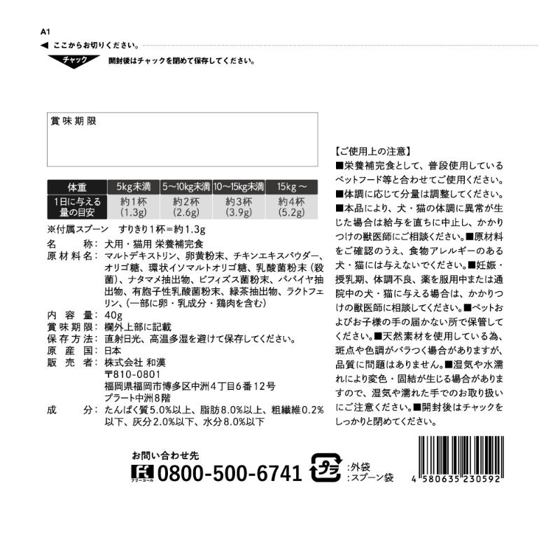 | 素材 | <原材料> マルトデキストリン、卵黄粉末、チキンエキスパウダー、オリゴ糖、環状イソマルトオリゴ糖、乳酸菌粉末(殺菌)、ナタマメ抽出物、ビフィズス菌粉末、パパイヤ抽出物、有胞子性乳酸菌粉末、緑茶抽出物、ラクトフェリン、(一部に卵・乳成分・鶏肉を含む) <保証成分> たんぱく質5.0%以上、脂肪8.0%以上、粗繊維0.2%以下、灰分2.0%以下、水分8.0%以下 <エネルギー> 4.92kcal/1杯当たり (※付属スプーン:すりきり1杯=約1.3g) |
