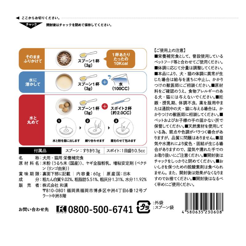 | 素材 | <原材料> 米粉(うるち米(国産))、ヤギ全脂粉乳、増粘安定剤(ペクチン(リンゴ由来)) <保証成分> 粗たんぱく質9.02%、粗脂肪5.51%、粗灰分1.31%、水分11.92% <エネルギー> 10kcal/1杯当たり (付属品:スプーンすりきり3g、スポイト1目盛り0.5㏄) |