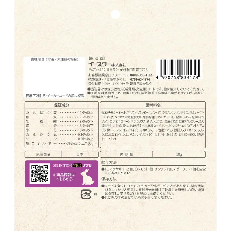素材 | <原材料> 牧草(チモシーミール、アルファルファミール、、スーダングラス、クレイングラス、バミューダヘイ)、えん麦、タピオカ澱粉、脱脂大豆、酵母抽出物(ヌクレオチド源)、乾燥にんじん、乾燥キャベツ、グルコサミン、コラーゲン、アガリクス(β-グルカン源)、乾燥小松菜、乾燥ブロッコリー、たんぽぽ粉末、おおばこ粉末、乾燥カモミール、乾燥ローズマリー、ビルベリーエキス(アントシアニジン源)、ルテイン、コンドロイチン、GABA(γ-アミノ酪酸)、アミノ酸類(DL?メチオニン、L-リジン、BCAA(L-ロイシン、L-バリン、L-イソロイシン))、ミネラル類(食塩)、ビタミン類(C)、甘味料(ソーマチン) <保証成分> たんぱく質11.0%以上、脂質2.5%以上、粗繊維18.0%以下、灰分8.5%以下、水分10.0%以下 <エネルギー> 395kcal以上/100g |