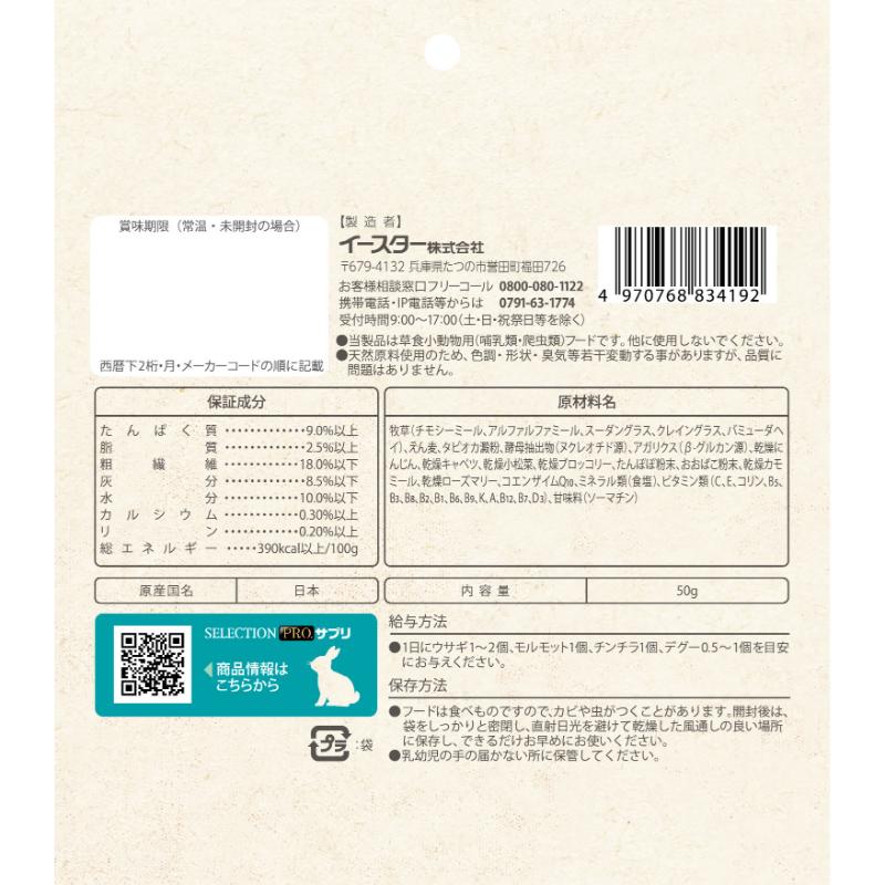 素材 | <原材料> 牧草(チモシーミール、アルファルファミール、、スーダングラス、クレイングラス、バミューダヘイ)、えん麦、タピオカ澱粉、酵母抽出物(ヌクレオチド源)、アガリクス(β-グルカン源)、乾燥にんじん、乾燥キャベツ、乾燥小松菜、乾燥ブロッコリー、たんぽぽ粉末、おおばこ粉末、乾燥カモミール、乾燥ローズマリー、コエンザイムQ10、ミネラル類(食塩)、ビタミン類(C、E、コリン、B5、B3、B8、B2、B1、B6、B9、K、A、B12、B7、D3)、甘味料(ソーマチン) <保証成分> たんぱく質9.0%以上、脂質2.5%以上、粗繊維18.0%以下、灰分8.5%以下、水分10.0%以下 <エネルギー> 390kcal以上/100g |