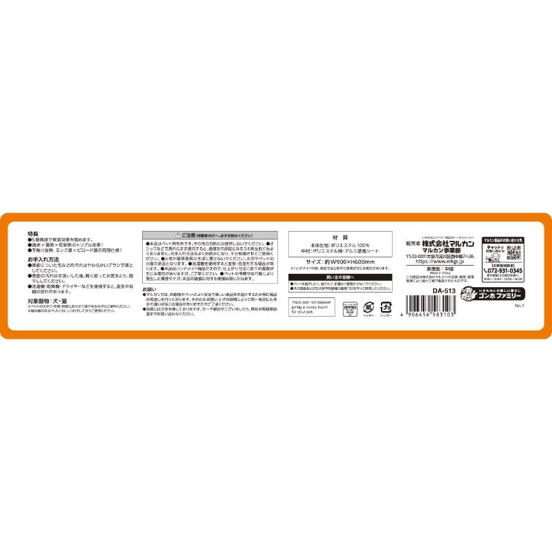 注意事項 | ・本品はペット用毛布です。その他の目的には使用しないでください。 ・オシッコなどで濡れたまま使用すると、色落ちの原因となるうえ衛生的にもよくありません。お手入れ方法をよくお読みになり、十分乾燥させてご使用ください。 ・火気や暖房器具のそばに置かないでください。火災やペットの火傷の原因となります。 ・洗濯機を使用すると変形、色落ちする場合があります。 ・本品はハンドメイド商品ですので、仕上がり方法に若干の差異が生じる場合がありますが、ご了承ください。 |